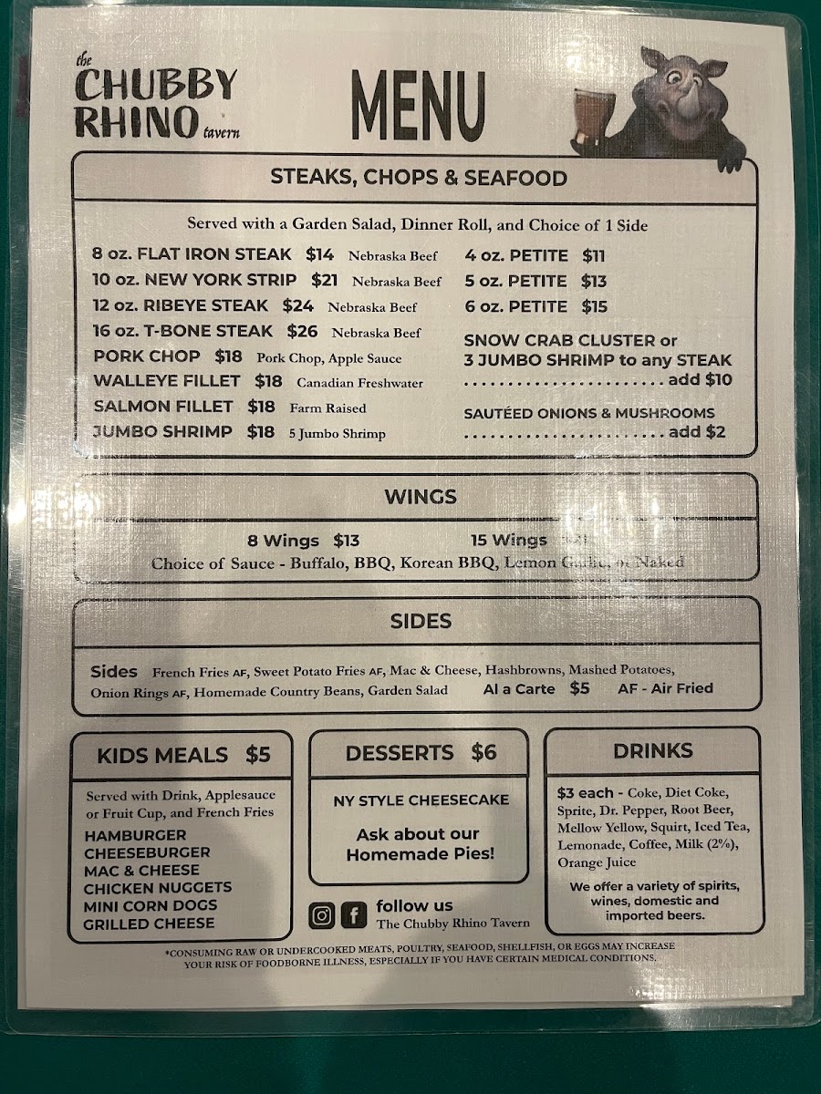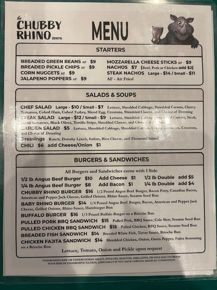 Step right up and get ready to dive into the delicious world of the The Chubby Rhino Menu. From the moment you flip through, you can tell this place isn’t holding back-each dish is packed with flavor and personality. Whether you’re in the mood for a hearty burger that practically melts in your mouth or a plate of crispy, golden fries that hit all the right notes, you’ll find something that hits the spot. The variety keeps things exciting too, with fresh salads, comfort-food classics, and a few surprises that make every visit feel like a mini adventure. Drinks and sides complement the main dishes perfectly, making it easy to mix and match your favorites. What’s fun about exploring this menu is that every choice feels like a little reward-whether it’s a bold flavor combo or a cozy favorite done just right. So go ahead, take your time, scroll through the options, and imagine tasting every item as you go, because there’s a little something here for everyone to enjoy.